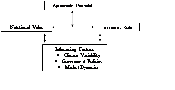 A conceptual framework for analyzing finger millet’s role in farming systems integrates three interconnected dimensions-agronomic potential, nutritional value, and economic role-which are influenced by overarching factors like climate variability, government policies, and market dynamics. These dimensions form a dynamic feedback loop that shapes the adoption, cultivation, and impact of finger millet.